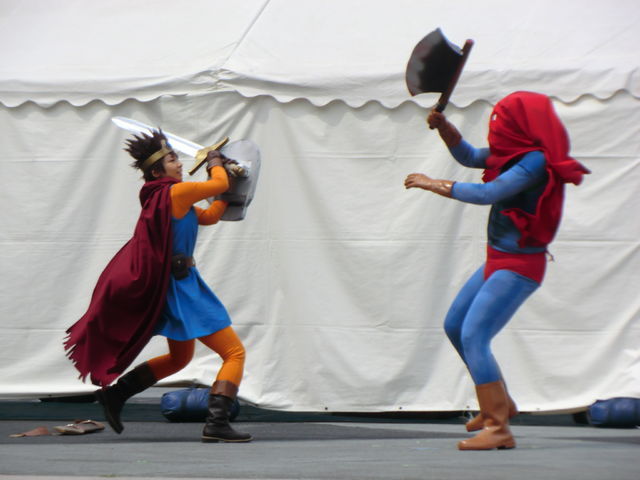 鞘から剣を引き抜く動作、盾の構え方、見栄の切り方が上手い。そして振り降ろした斧が地面に刺さって抜けない等、小芝居が利いていた。