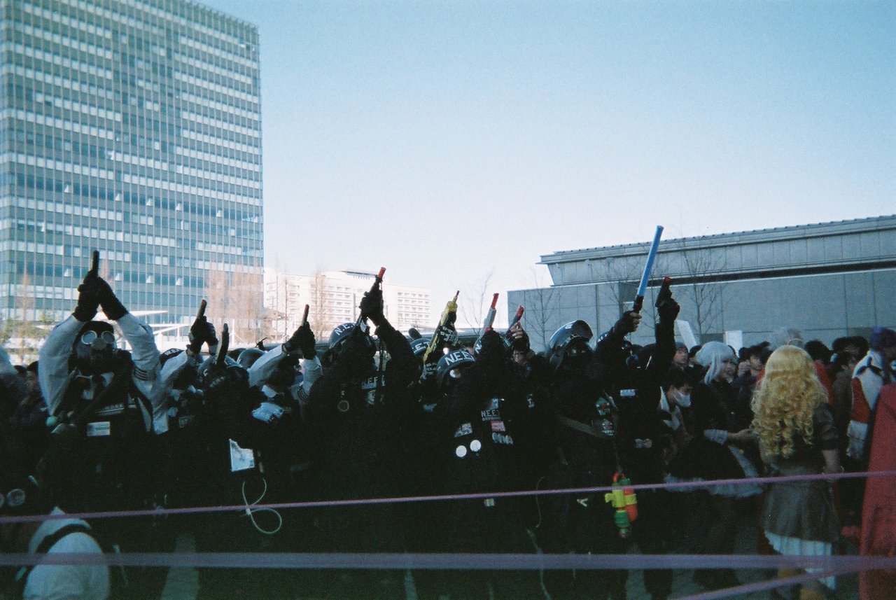 ご本人は主に愛知県で活動してて仕事でのコスプレが主なので、それを関東で/無料で撮影できる機会という事で、100名超のカメラマンが囲んで延々と撮り続ける人の山は、コミケ史上においても珍しい光景だったに違いない。