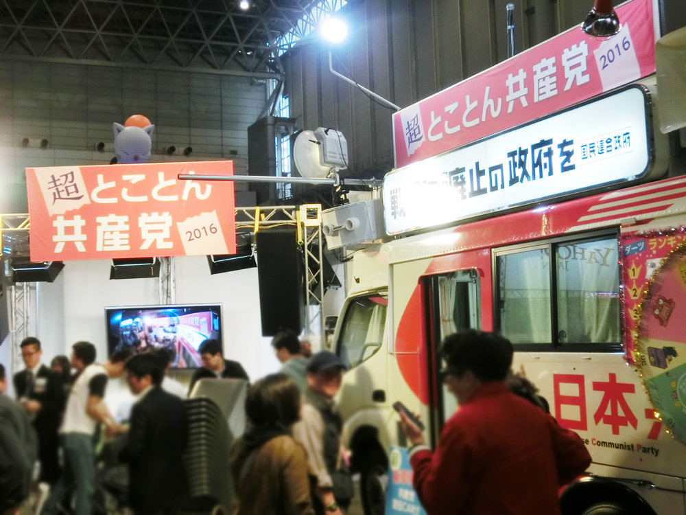 2年ぶりで最後の出展となった共産党は「超とことん共産党」としておなじみ労働問題の他、戦争法廃止を訴える。前年末に可決した集団的自衛権行使を容認する安保法制の危険性を訴えるためとはいえ、これを戦争法と呼び変えるのはさすがにニコニコユーザーに対してもあんまり響いてなかった気がする。