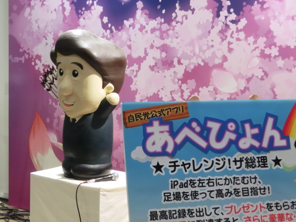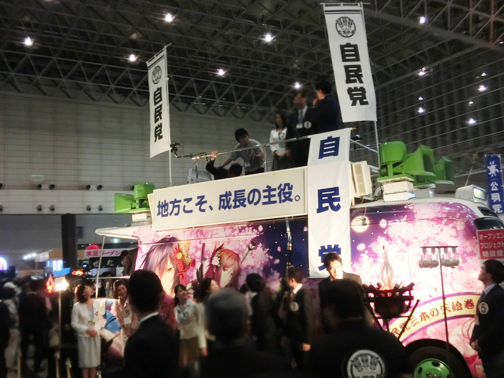 参院選を控えて2年ぶり出展となった自民党(超自民党)はあべぴょんを再登場させ、iPad連携のゲーム。アベノミクスの「三本の矢」をモチーフにブース全体を戦国絵巻っぽく装飾。CARNELIAN氏イラストの宣伝カーにのぼり旗も武将っぽい。