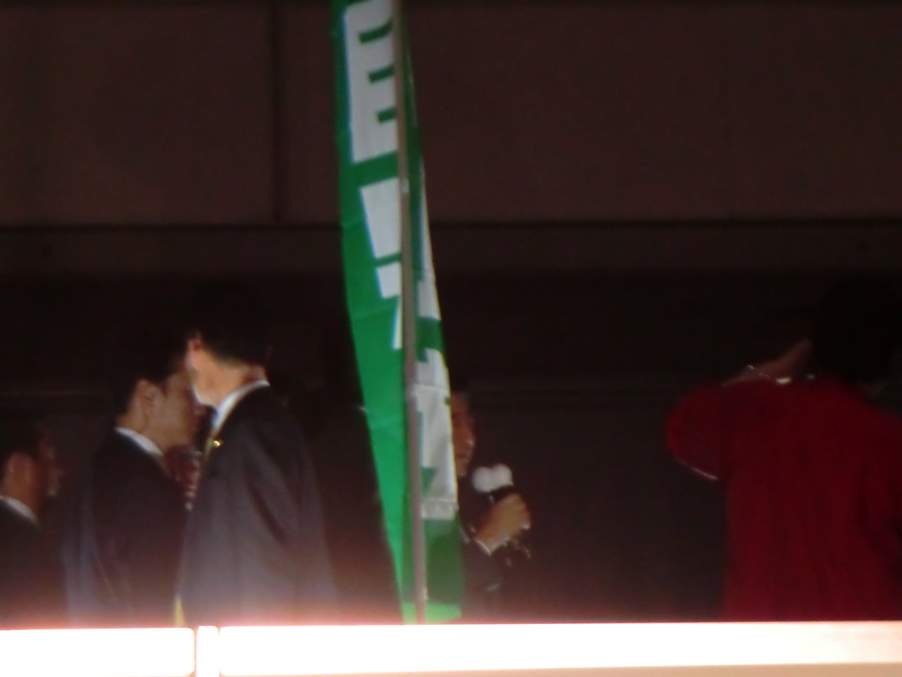 後日ニュース番組の中には「国旗を手に首相の演説を聞く若者の姿も」というようなナレーションで放送されていたが、一応補足すると事前に首相の来場予告も無いのに普段から国旗を持ち歩いてるニコ動ユーザーはさすがにいません。この国旗は宣伝カーの備品として会場に用意されていたものです。