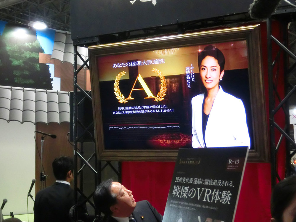 そんな野田前首相、閉場直前にVR蓮舫を体験。追及の数々にまったく心拍数を乱さず、「総理大臣適正 A」判定を獲得。