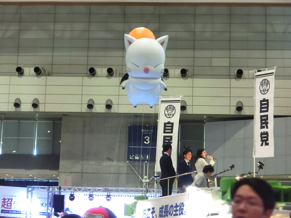 ところでお気づきの方いると思いますが、政党ブースの後ろにスクエニブースがあり、ゲームショウなどでもおなじみ巨大モーグリがちょいちょい映っております。狙った訳でもないのですが…。
