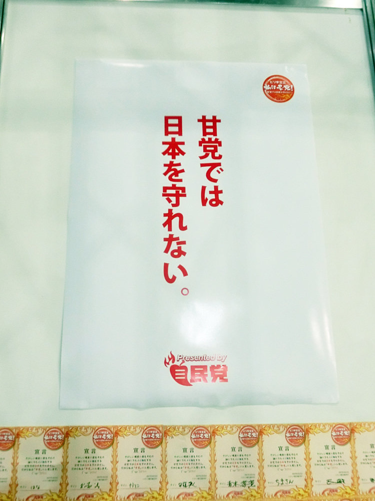 一応「甘党では日本を守れない」というポスターが貼ってあるものの、政治が対外強硬姿勢を示した際は、外側の敵に目を向けさせる事で内政の失敗を隠そうとする意図がある場合が多いですので忘れずに。