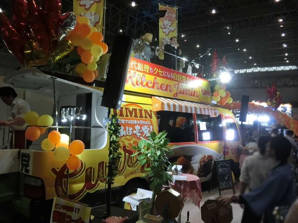 自民党は開催2日前になってMAPに追加。ブース名も超自民党ではなく自民党という表記になり、面積も史上最小。内容も前々年と比べて簡素化されており、メインは宣伝カーをカレー屋に仕立ててバルーン装飾。