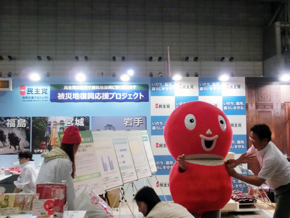 民主党ブースでは前年コケた講演だけでなく、東北の復興支援活動の紹介パネル。政党というよりも市民団体やNPO法人っぽい。