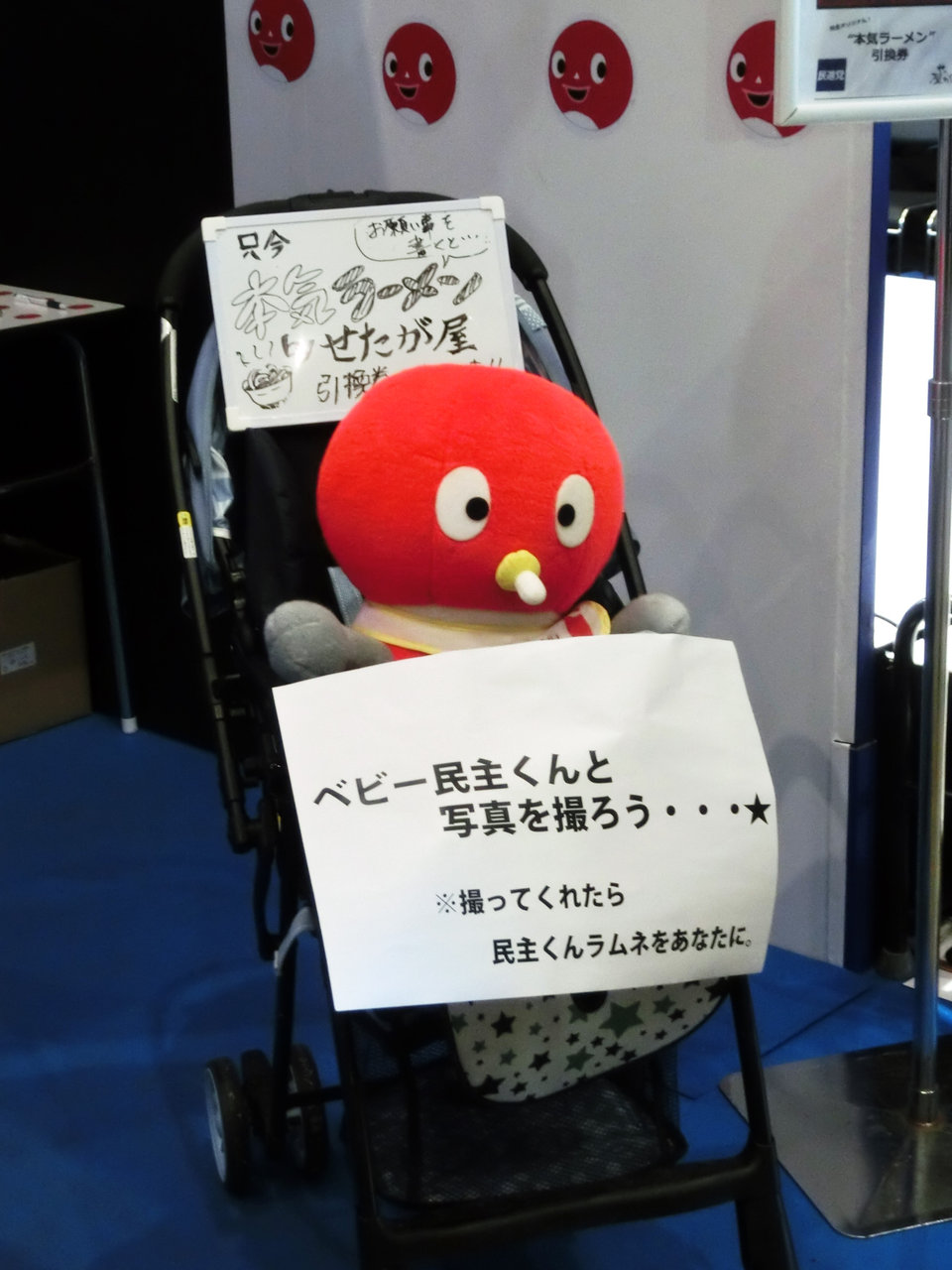 元公式キャラの民主くんはベビー民主くんとしてぬいぐるみで展示。また抱き枕といった(どうでもいい)グッズ類も。さらには せたが屋とコラボして、ブースで願い事を書くと醤油ラーメンが食べられるという謎展開に。