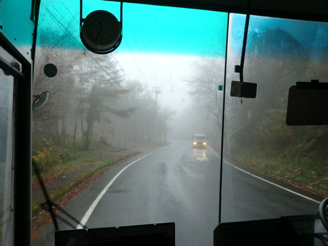 バスから見える光景。紅葉が綺麗。もっと晴れればな…。