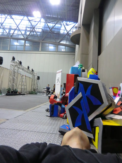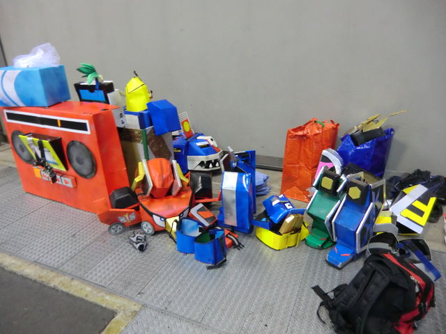 ホラ、着ぐるみって暑いから一旦脱いで、一部を補修して、男3人、本番まで体力回復のために寝てたんだよ…。